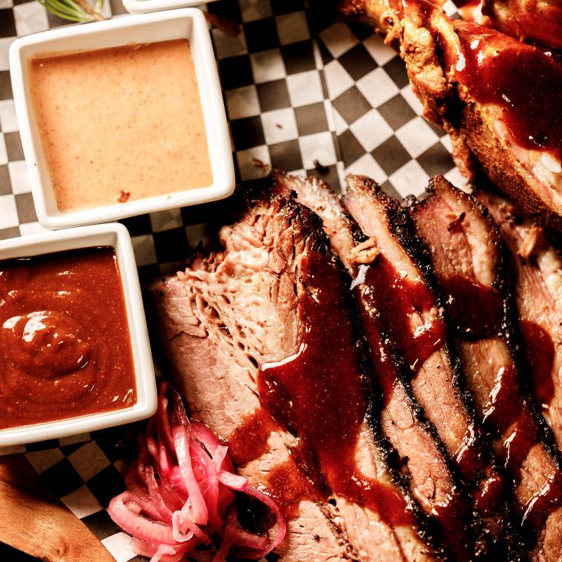 Green plantains topped with brisket, pulled pork, and chicken, a Texas-Caribbean fusion bite with sweetness, smoke, and crunch.